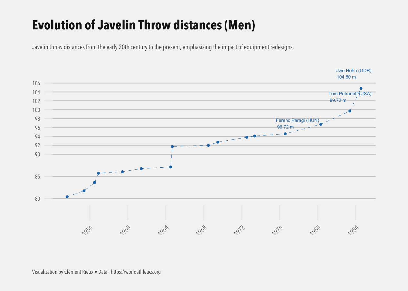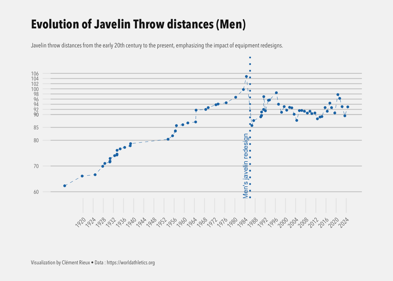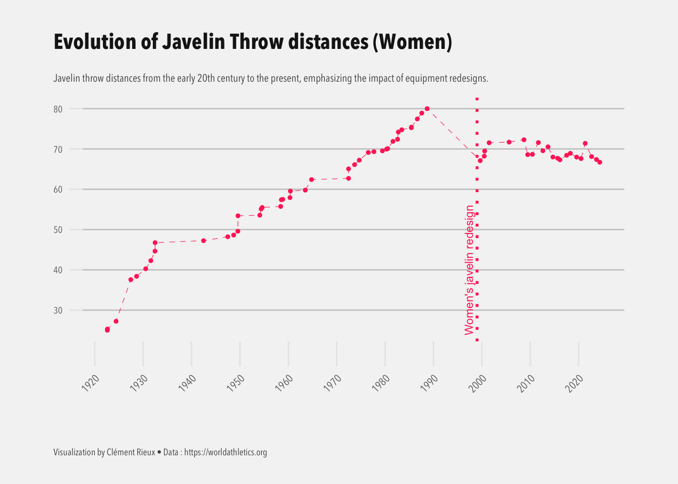 Initially, the men’s javelin was standardized at a weight of 800 grams and a length of 2.6 meters. The women’s javelin, introduced later, weighs 600 grams and measures between 2.2 meters. These specifications have remained constant, but the center of gravity was adjusted in the 1980s for men and the 1990s for women to reduce excessively long throws that risked leaving the field of play. This change also improved safety and shifted the focus back to technique over pure power.