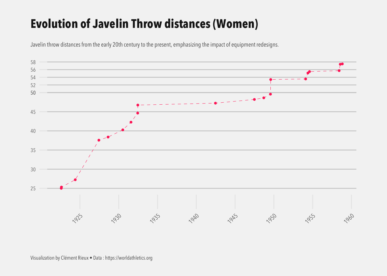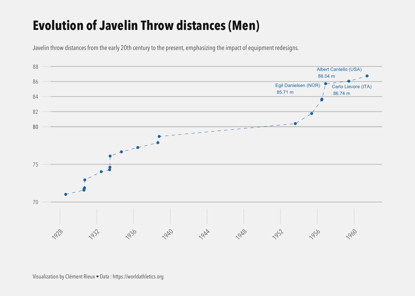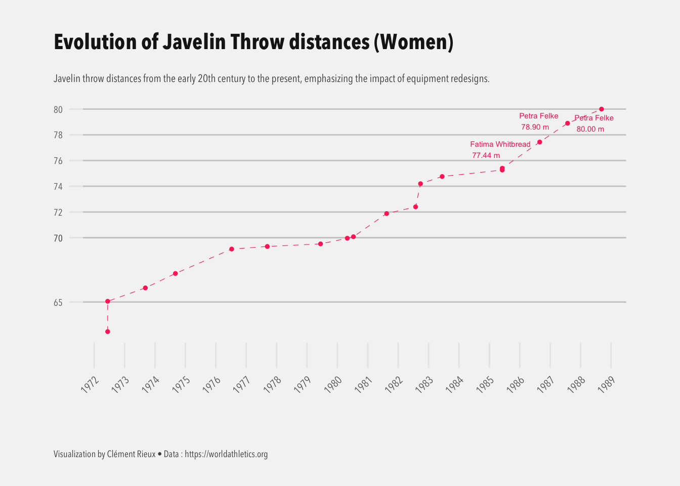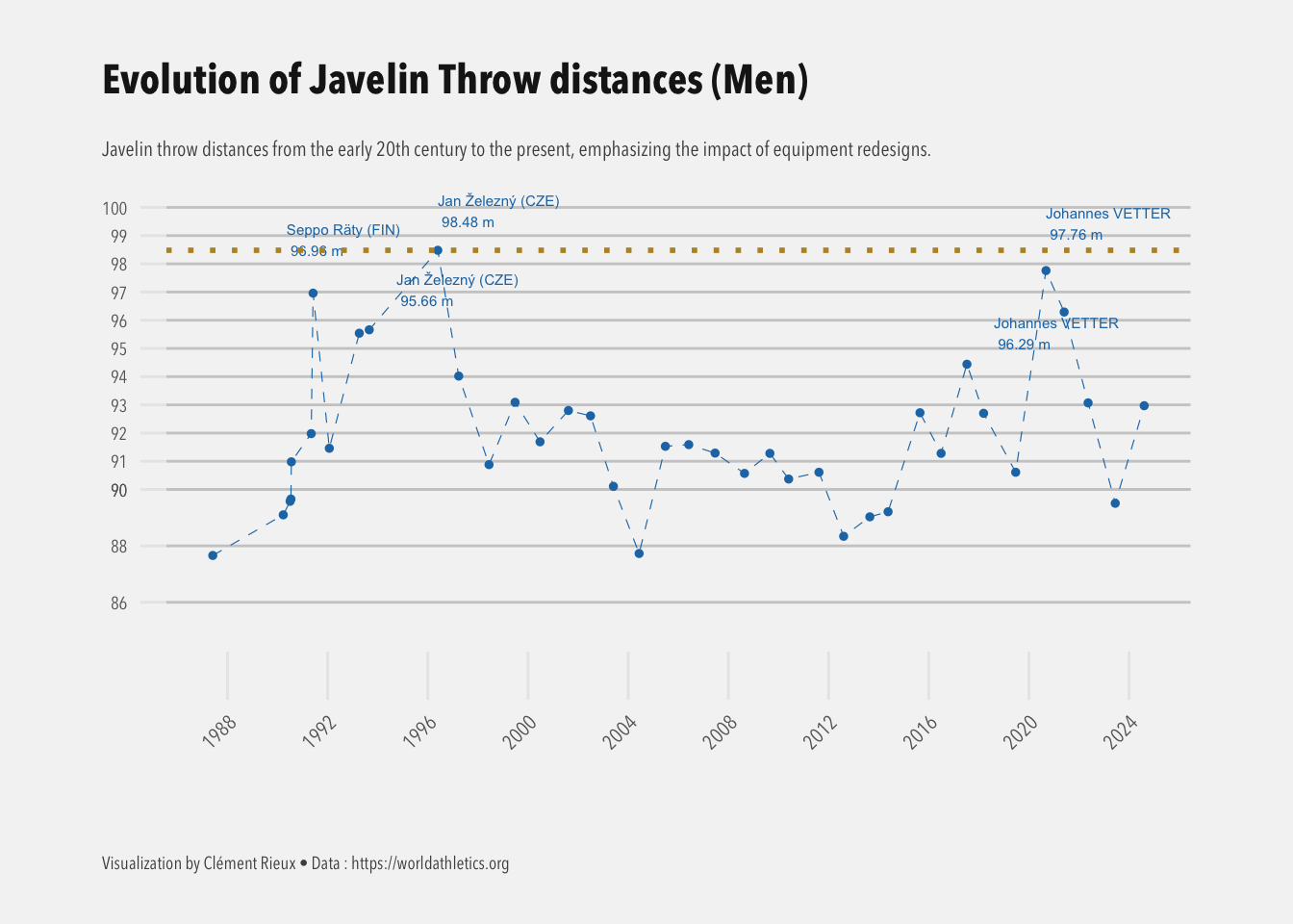 Initially, the men’s javelin was standardized at a weight of 800 grams and a length of 2.6 meters. The women’s javelin, introduced later, weighs 600 grams and measures between 2.2 meters. These specifications have remained constant, but the center of gravity was adjusted in the 1980s for men and the 1990s for women to reduce excessively long throws that risked leaving the field of play. This change also improved safety and shifted the focus back to technique over pure power.