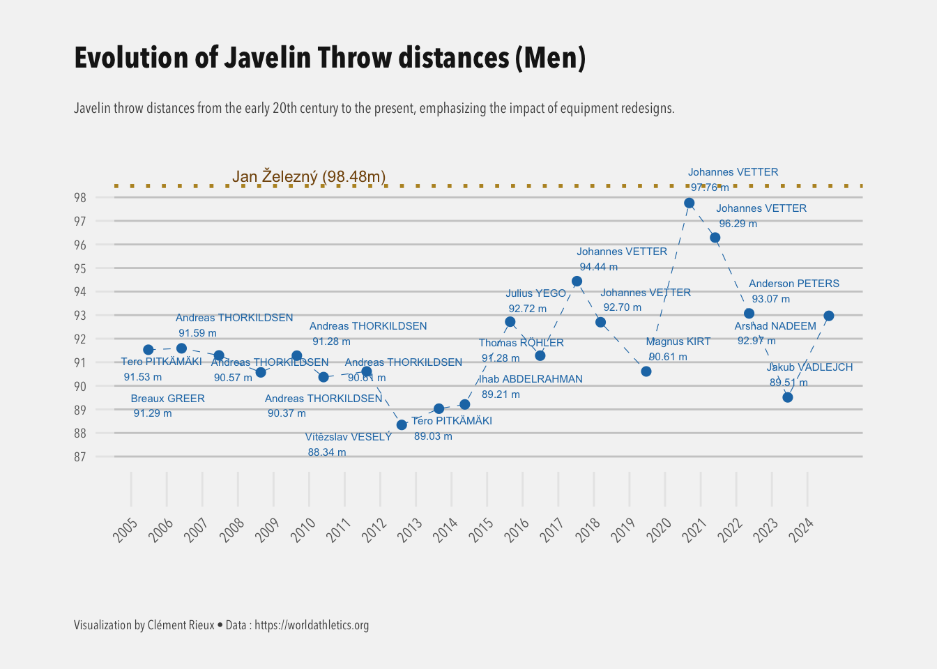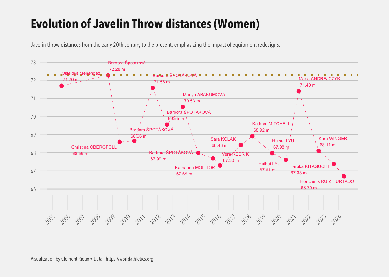 The current javelin records : Jan Železný’s 98.48 meters and Barbora Špotáková’s 72.28 meters are remarkable feats, but as athletics evolves, these records may one day be challenged.